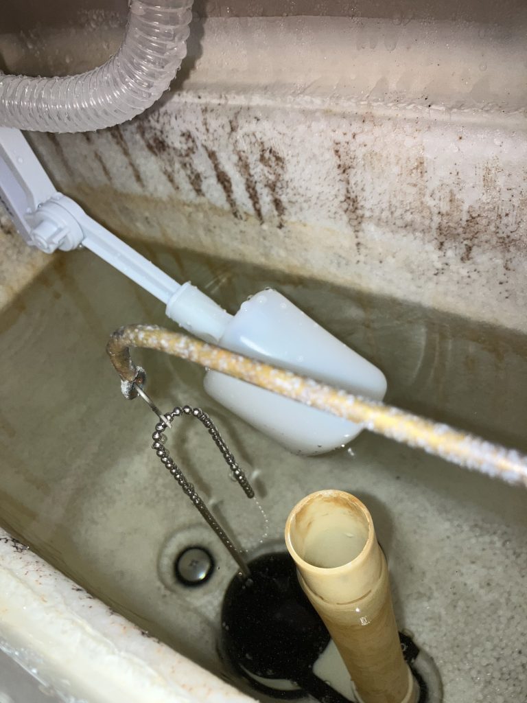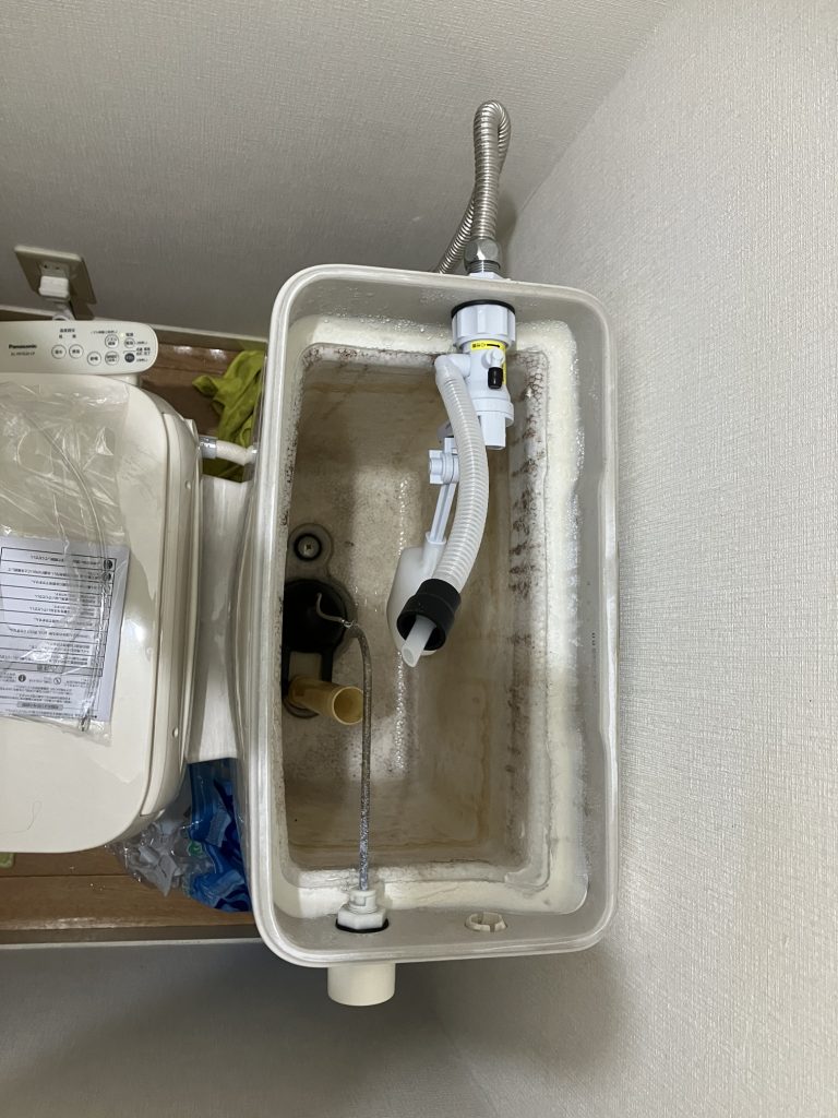水が止まりきらず、オーバーフロー管から水が流れている状態でした。