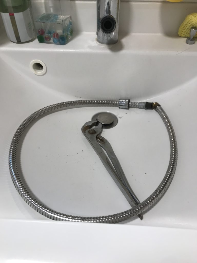 お客様より、洗面水栓のホースから水が漏れるので直してほしいとのご依頼を受けました。